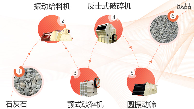 物料由GZD-1500×5600振动给料机均匀、定量、连续地输送进PE-1200×1500鄂式破碎机,进行粗碎,粗碎后的石料由输送机送到PF-1520反击式破碎机进行细碎;破碎后的物料由输送机送进振动筛进行筛分,符合粒度要求的石料由成品输送机送往成品料堆;不符合粒度要求的物料由输送机返料送到PF-1520反击式破碎机再次破碎,形成闭路多次循环。生产过程中,各级设备配备合理,提高了生产效率。
