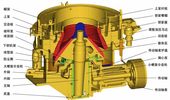 圆锥式破碎机主要由机架、定锥总成、动锥总成、弹簧机构、碗型轴架部以及传动等部分组成。另外圆锥式破碎机辅助部分由电气系统、稀油润滑系统、以及液压清腔系统组成。以下是介绍圆锥式破碎机的结构组成。