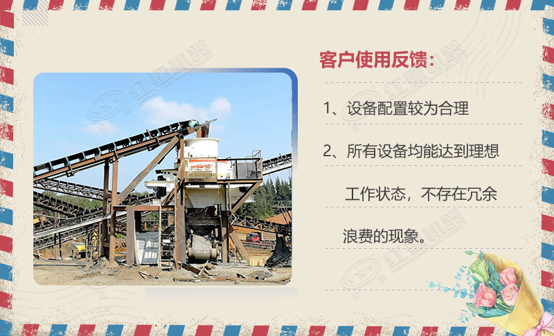 整条制沙生产线设备配置较为合理,所有设备均能达到理想工作状态,不存在冗余浪费的现象,且产出的沙石成品也都不错(可以卖上好价钱),仅投产半年已处于盈利状态,客户表示很满意!