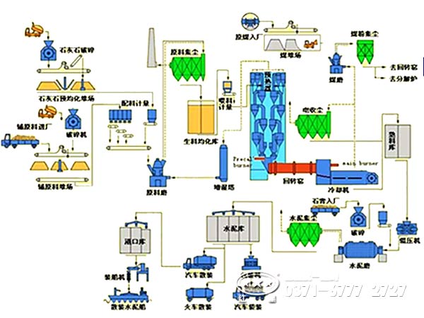 白灰回转窑煅烧工艺可以分为湿法与干法,根据物料性质而选择。通常多用湿法工艺。湿法回转窑生产时在生料磨中加入水,将生料制成含水为3%5左右的料浆,经均化达到要求的料浆由窑头喂料机送入窑内煅烧成熟料,出窑熟料经冷却机冷却,送入熟料库,原煤经烘干兼粉磨成煤粉后再燃烧供给给熟料煅烧所需热量。