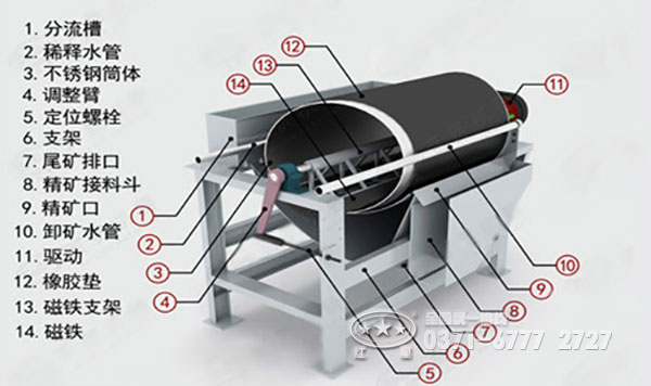 当矿物颗粒和脉石颗粒通过钾长石除铁磁选机磁场时,由于矿粒的磁性不同,在磁场的作用下,它们运动的方式不同。磁性矿粒受磁力的吸引,附着在除铁机的圆筒上,被圆筒带到一定的高度后,脱离磁场从筒上利用高压冲洗水冲落。非磁性颗粒(脉石颗粒)在除铁机磁场中不受磁力的吸引,因而不能附着在圆筒上。除铁机得到两种产品,一种是磁性产品进人尾矿箱,另一种是非磁性产品进人精矿箱,这样就可以对钾长石进行提纯。