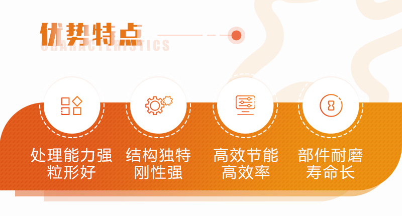 进料口大、破碎腔高、适应物料硬度高、块度大、产品石粉少。
